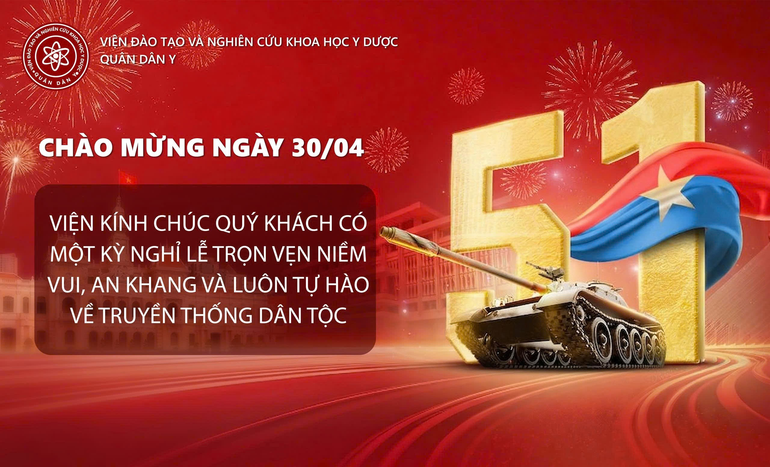 Viện Đào tạo và Nghiên cứu Khoa học Y Dược Quân Dân Y kính chúc toàn thể cán bộ, giảng viên, học viên cùng quý đối tác, quý nhân dân một kỳ nghỉ lễ an toàn, ý nghĩa và mạnh khỏe.