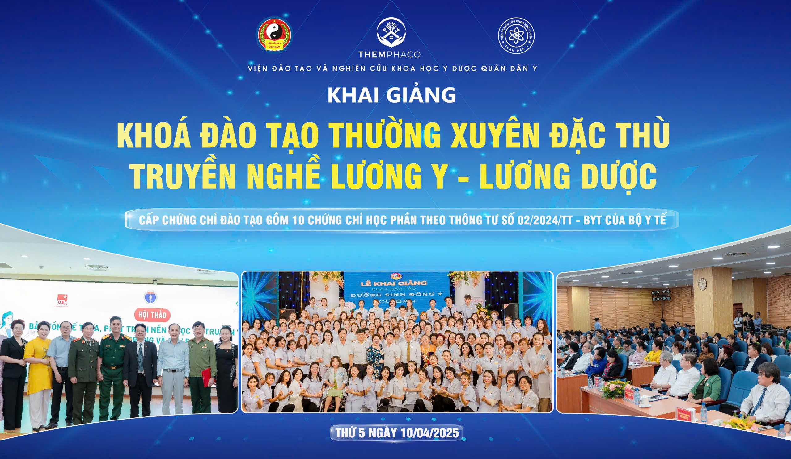 Ngày 10/4/2025, tại Hà Nội, Viện Đông y Việt Nam phối hợp với Viện Đào tạo và Nghiên cứu Khoa học Y Dược Quân Dân Y long trọng tổ chức Lễ Khai Giảng Khóa Đào Tạo Đặc Thù Thường Xuyên - Truyền Nghề Lương Y, Lương Dược K01 (2025).