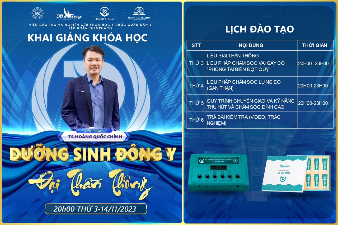 Ngày 14/11/2023, Khoá đào tạo Dưỡng Sinh Đông Y Đại Thần Thông, đào tạo qua zoom online được tổ chức bởi Viện Đào Tạo Và Nghiên Cứu Khoa Học Y Dược Quân Dân Y và sự hợp tác chặt chẽ cùng Tập Đoàn Themphaco, sự kiện đã thu hút sự quan tâm đặc biệt từ cộng đồng y học và cộng đồng quan tâm đến chăm sóc sức khỏe, làm đẹp thông qua Dưỡng Sinh Đông Y.