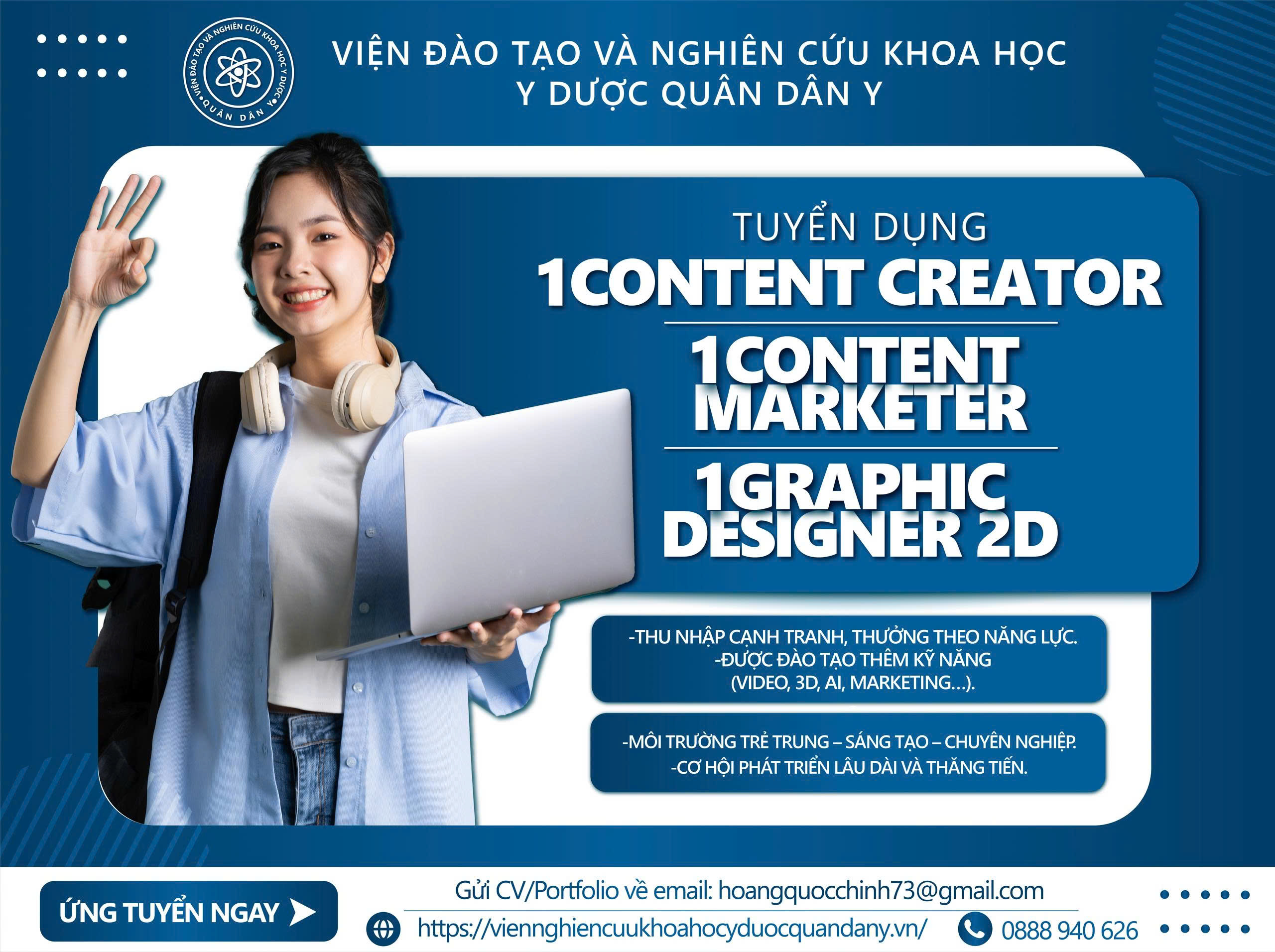 Viện Đào tạo & Nghiên cứu Khoa học Y Dược Quân Dân Y trân trọng thông báo tuyển dụng các vị trí thuộc khối sáng tạo và truyền thông