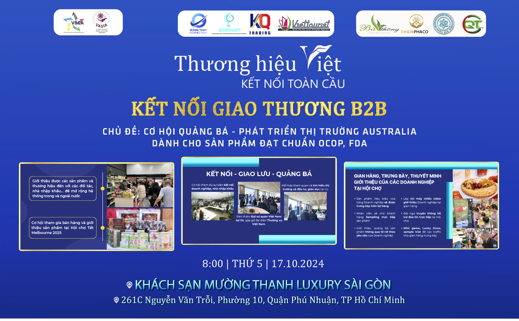 TP. Hồ Chí Minh, ngày 17 tháng 10 năm 2024 – Trong bối cảnh hội nhập quốc tế ngày càng sâu rộng, Viện Đào tạo và Nghiên cứu Khoa học Y Dược Quân Dân Y tự hào thông báo sự tham gia của mình trong sự kiện mang tính chất quan trọng, mang tên "Thương Hiệu Việt Kết Nối Toàn Cầu - Kết Nối Giao Thương B2B," diễn ra tại Khách sạn Mường Thanh Luxury Sài Gòn, 261C Nguyễn Văn Trỗi, Phường 10, Quận Phú Nhuận, TP. Hồ Chí Minh.