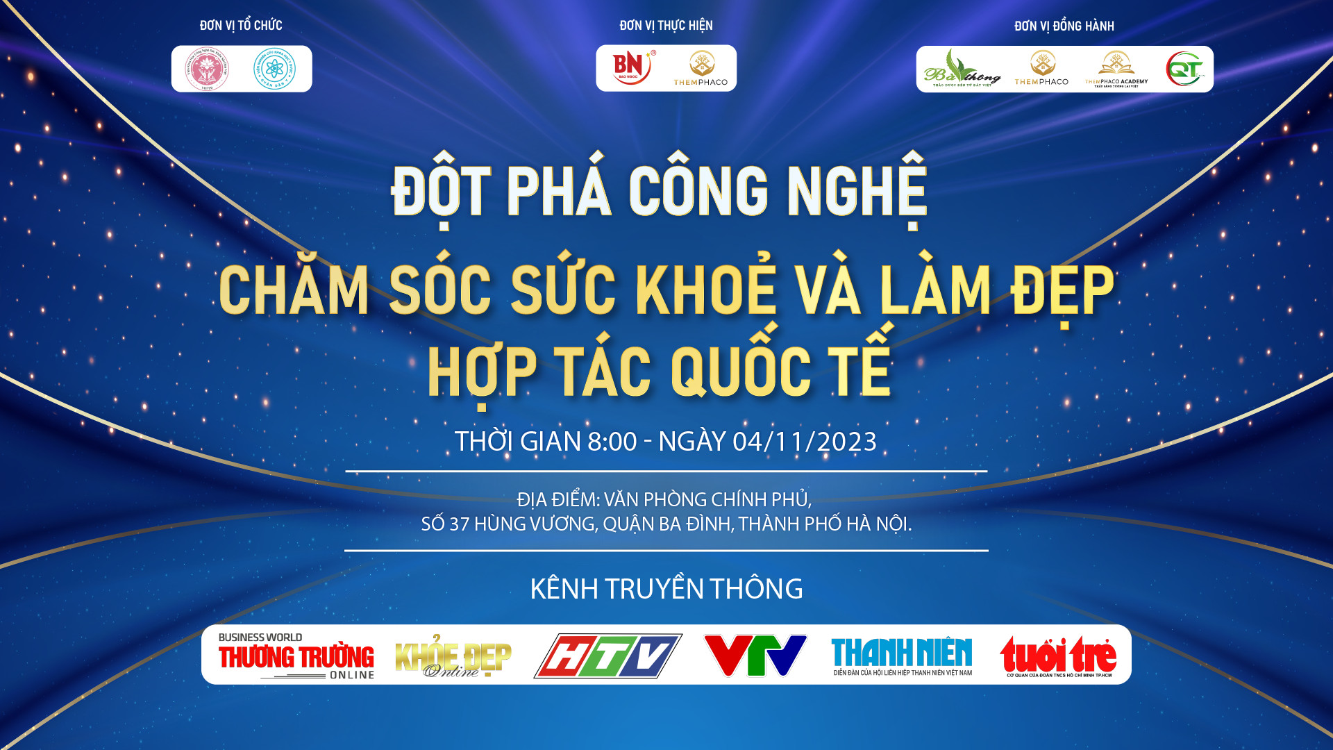 Ngày 4/11/2023, tại hội trường VĂN PHÒNG CHÍNH PHỦ, số 37, Hùng Vương, Ba Đình, Hà Nội, một sự kiện đầy ấn tượng và quan trọng với tên gọi "Đột Phá Công Nghệ Chăm Sóc Sức Khỏe Và Làm Đẹp - Hợp Tác Quốc Tế" đã được Viện Đông Y Việt Nam, Viện Khoa Học Công Nghệ Sức Khỏe Sắc Đẹp Việt, Viện Nghiên Cứu Các Bài Thuốc Dân Tộc Việt Nam phối hợp cùng Viện Đào Tạo Và Nghiên Cứu Khoa Học Y Dược Quân Dân Y, công ty Bảo Ngọc Sài Gòn, Tập đoàn Themphaco tổ chức thành công ngoài mong đợi. Sự kiện này đã thu hút sự tham gia của nhiều lãnh đạo cấp cao và chuyên gia hàng đầu trong lĩnh vực chăm sóc sức khỏe và làm đẹp, cùng với hơn 500 khách tham dự.