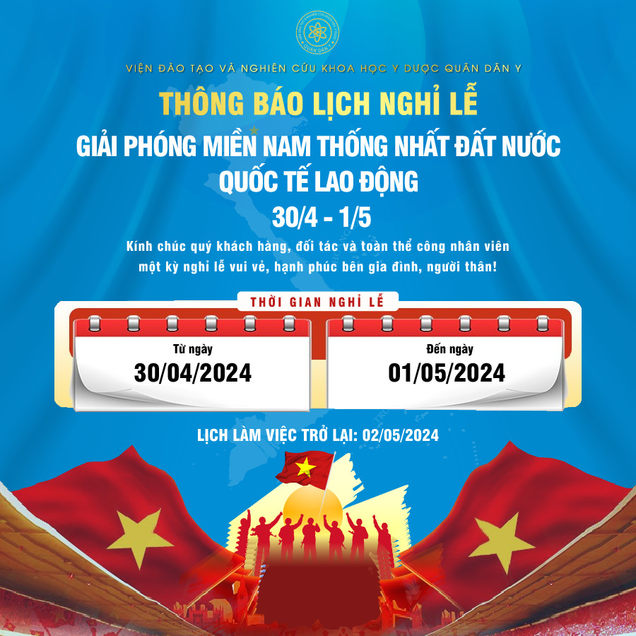 Trong không khí hân hoan và vui mừng chào đón kỷ niệm ngày Giải phóng miền Nam thống nhất đất nước 30/4, ngày Quốc tế lao động 1/5, Viện Đào Tạo Và Nghiên Cứu Khoa Học Y Dược Quân Dân Y xin kính chúc toàn thể người dân, các cán bộ, công nhân viên, quý đối tác và khách hàng có một kỳ nghỉ lễ vui vẻ, hạnh phúc và ý nghĩa bên gia đình, người thân!