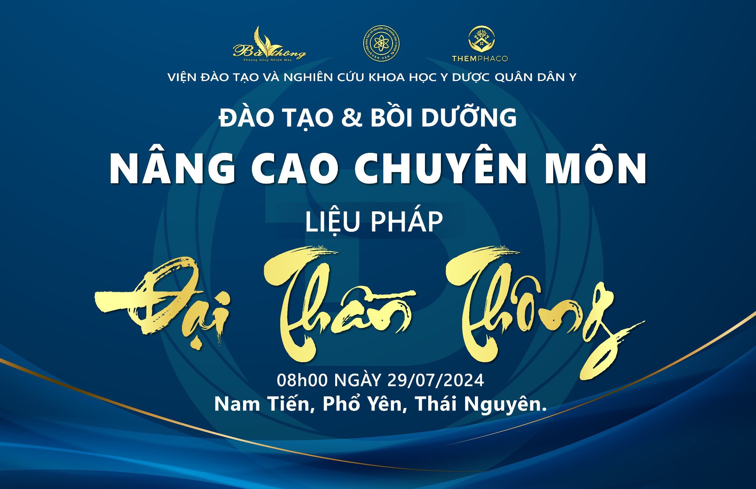 Chương trình đào tạo & bồi dưỡng nâng cao chuyên môn liệu pháp Đại Thần Thông được Viện đào tạo và nghiên cứu khoa học y dược Quân Dân Y kết hợp cùng Tập đoàn Themphaco tổ chức vào ngày 29/07/2024 với mục tiêu đào tạo, bồi dưỡng nâng cao kỹ năng và kiến thức liệu pháp Đại Thần Thông.